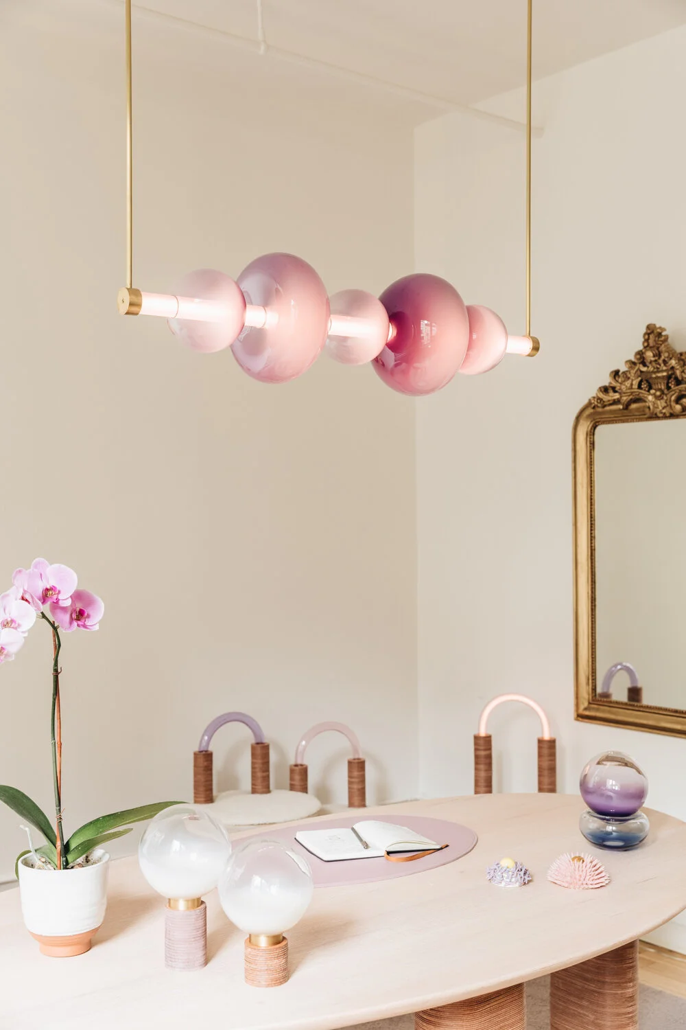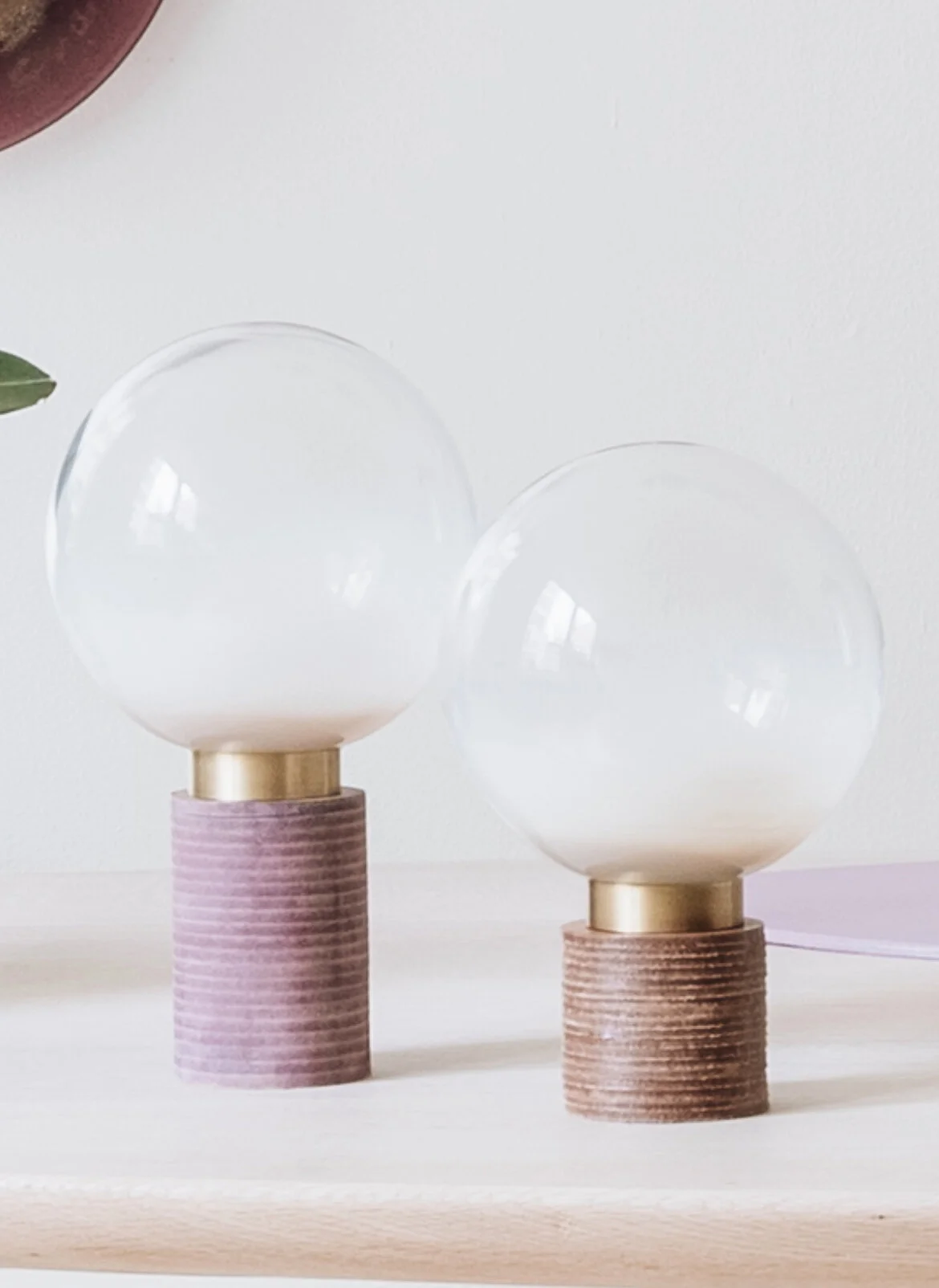 Made from individual discs of stacked leather, mouth blown glass sphere, and turned brass hardware.